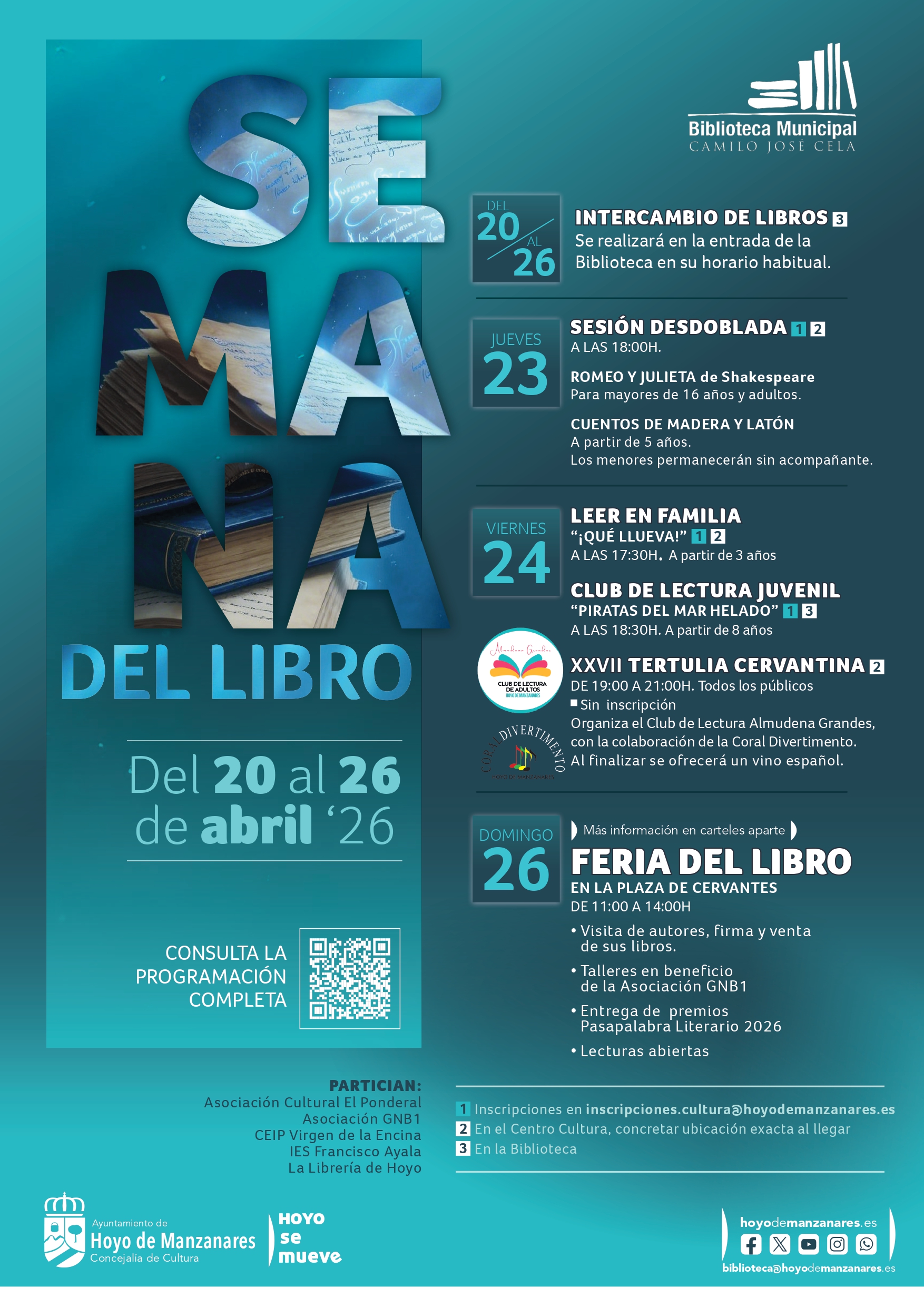 Del 20 al 26 de abril Hoyo de Manzanares celebrará su tradicional Semana del Libro con una programación para todos los públicos: cuentacuentos, visitas de autores, tertulia cervantina, Feria del Libro, talleres solidarios… Además, para los más jóvenes del municipio, se llevarán a cabo actividades de animación a la lectura en colaboración con los centros educativos CEIP Virgen de la Encina e IES Francisco Ayala, así como se realizará un punto de intercambio de libros en la entrada de la biblioteca municipal Camilo José Cela, en su horario habitual.